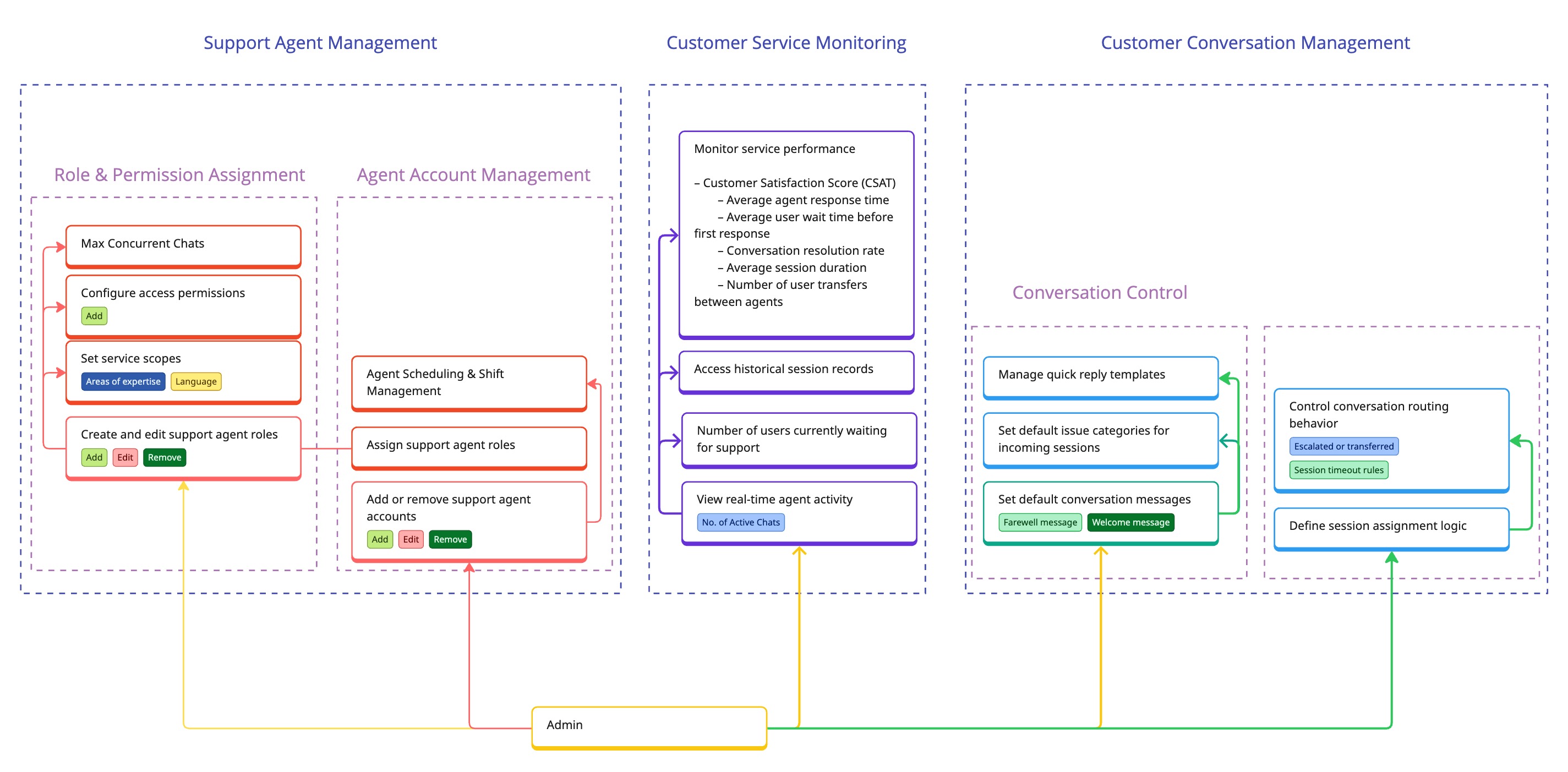 Admin: Manages platform configuration, agent permissions, and performance monitoring. They have no direct involvement in user conversations to maintain role separation.